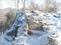 Cette section des très fragiles vestiges du mur Nord de la tour-beffroi, en cours de restauration, a dû être sécurisée pour l’hiver. La suite du chantier se fera la saison prochaine, avec le rajout d’éléments en partie haute et la consolidation du parement extérieur de la zone. Mais cela devra passer d’abord par une nouvelle autorisation de la D.R.A.C. et une campagne de fouilles, car des sols historiques devront être sondés, à la recherche d’autre éléments de mur enfouis et peut-être découvrirons nous la partie intérieure du chaînage de l’angle Nord/Est dont les vestiges sont visibles sur le rocher le long du GR en contrebas.