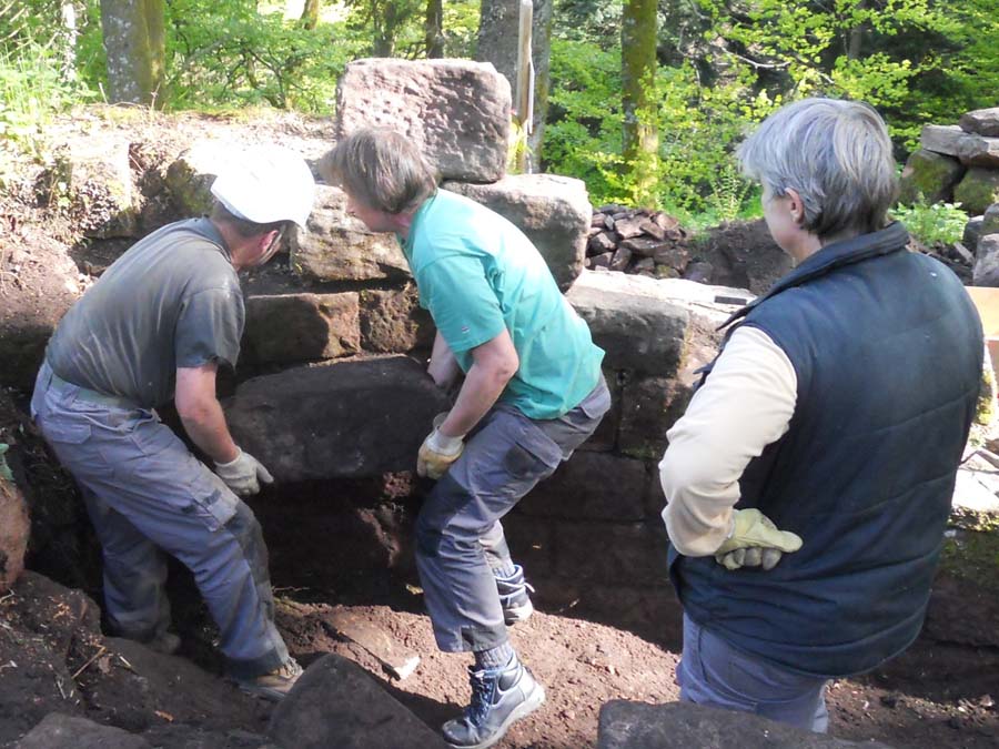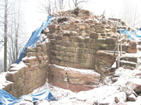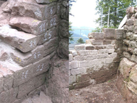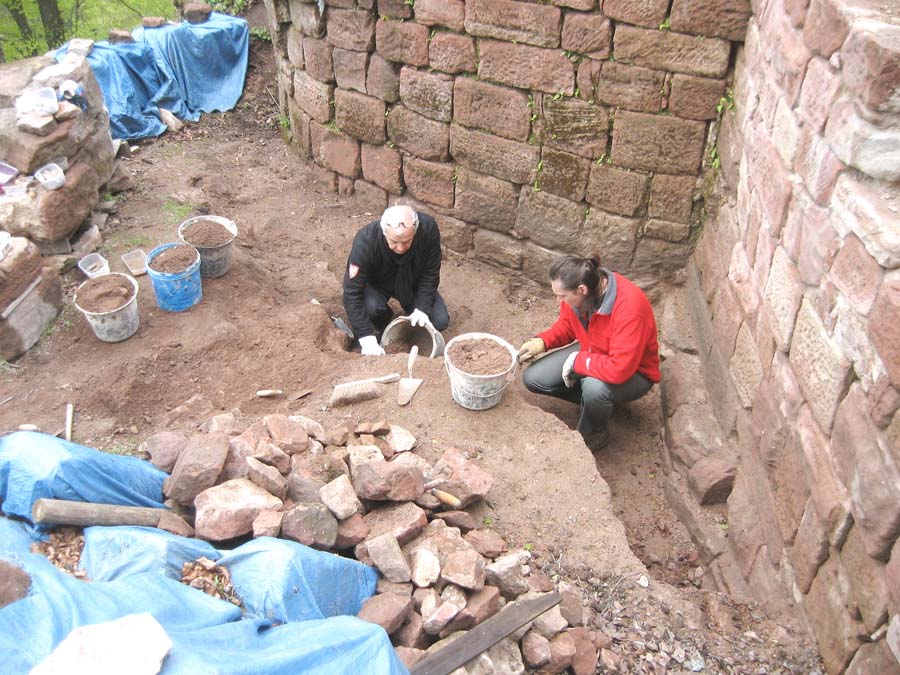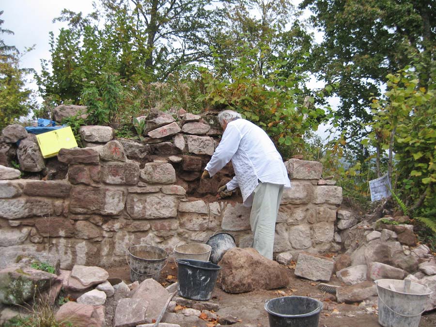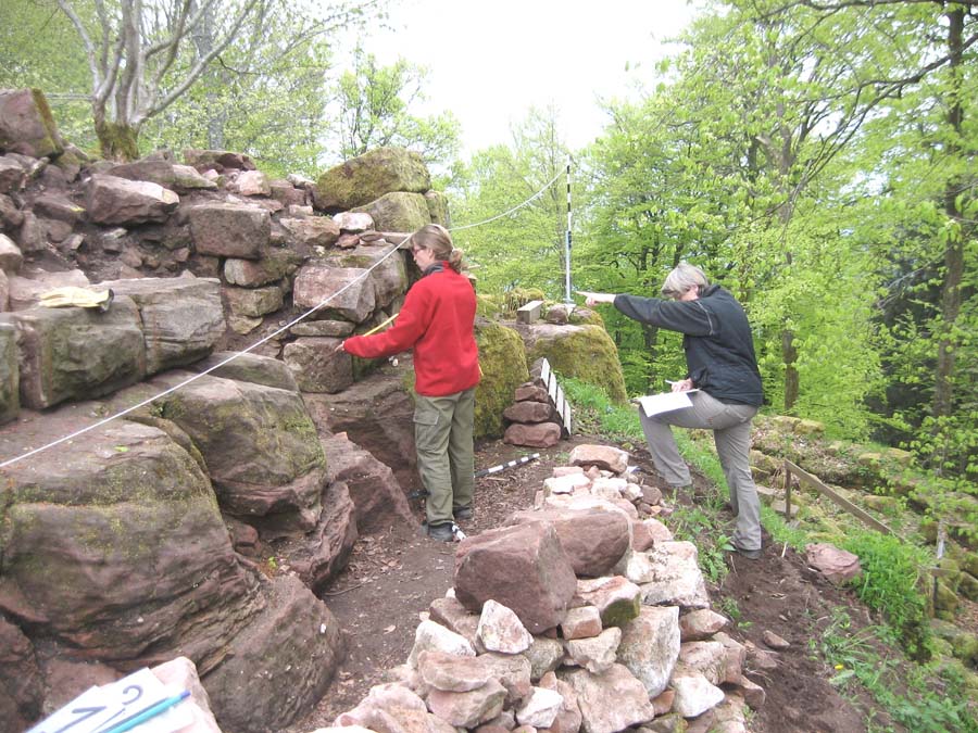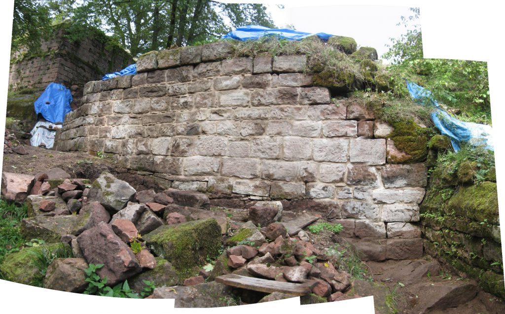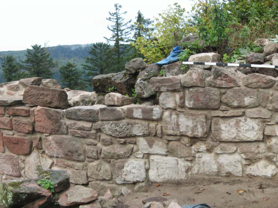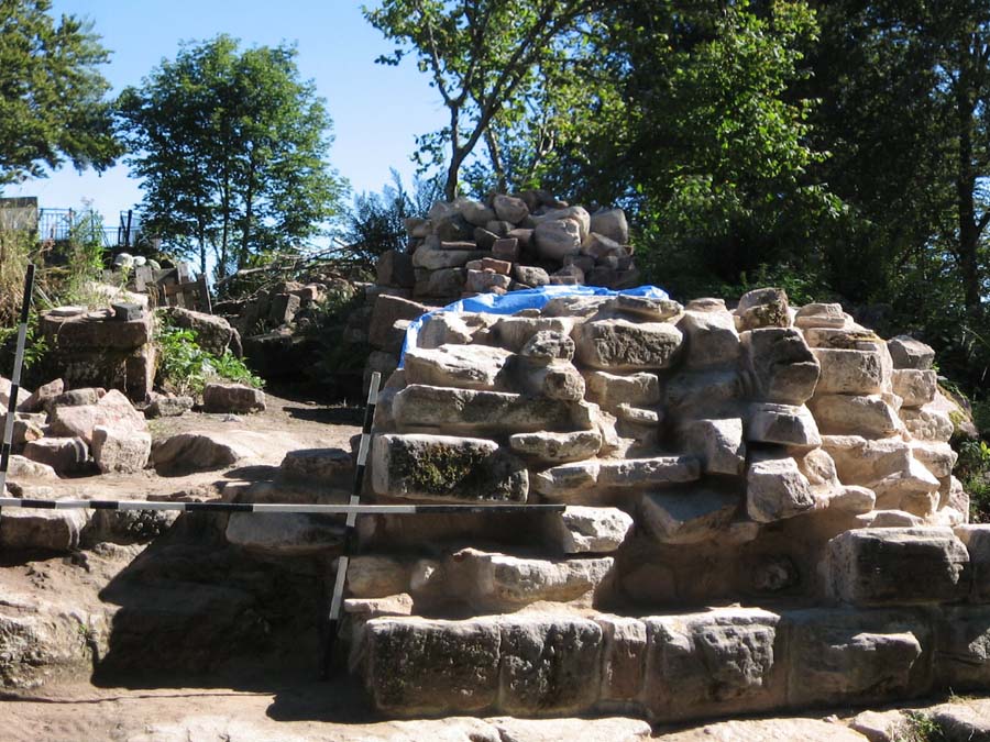 Nos actions se sont portées aussi sur le décaissement, le relevé par dessin, nettoyage de l’arase et la consolidation du mur « de gorge » en l’état. Ce mur ferme la tour de flanquement vers l’intérieur de la Kernburg (château primitif). Le dégagement de ce mur revêt une importance dans la compréhension de l’organisation du front défensif et des remaniements successifs qui ont eu lieu au fil des siècles et des besoins.