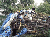 Les vestiges mis au jour ont pris une forme d’escalier, suivant en cela les inclinaisons des pentes d’éboulis au bas desquels sont allés rouler les versements provenant des têtes d’arases. L’accès à l’ensemble de cette zone de chantier est, de ce fait, assez délicat.