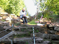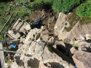Ces travaux sont délicats car il faut alterner les zones consolidées le long de l’arrachement, du bas vers le haut, évitant ainsi de surcharger les masses consolidées au risque d’aggraver la situation. Ce sont des maçonneries assez peu académiques, qui ont nécessité près de 200 kg de mortier par week-end, sans compter les pierres et les moellons de toutes tailles, ainsi que l’eau pour les séances de lavage, des travaux très éprouvants pour les veilleurs, dans leurs harnais de sécurité et suspendus au-dessus des pentes avec très peu de points d’appui pour leurs pieds.