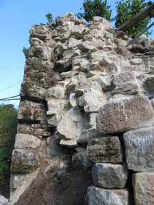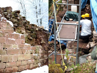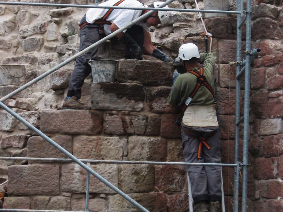Une troisième restauration a également été commencée, à l’autre bout du château, au niveau de la tour-beffroi, sur le mur Nord de la Bergfried, qui date de l’origine du castrum au tout début du XIIIème siècle. Cette restauration, présentant un caractère d’urgence, a dû être entreprise à la suite d’une série de versements de pierres de parements depuis les vestiges de têtes d’arases, d’une grande fragilité, qui avaient commencés à se dégrader dangereusement l’hiver dernier, menaçant même de dégringoler sur le GR en contrebas.