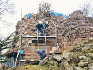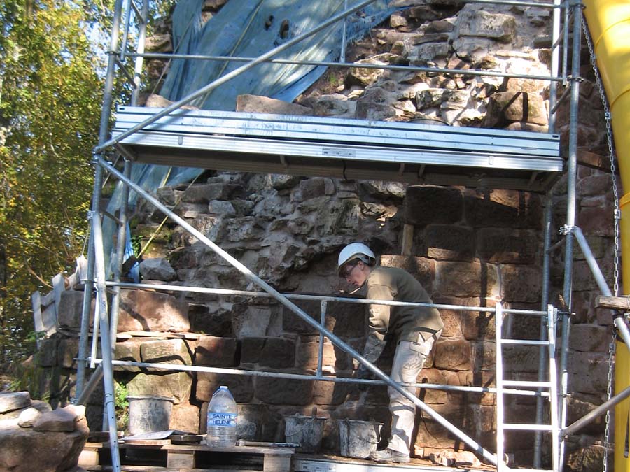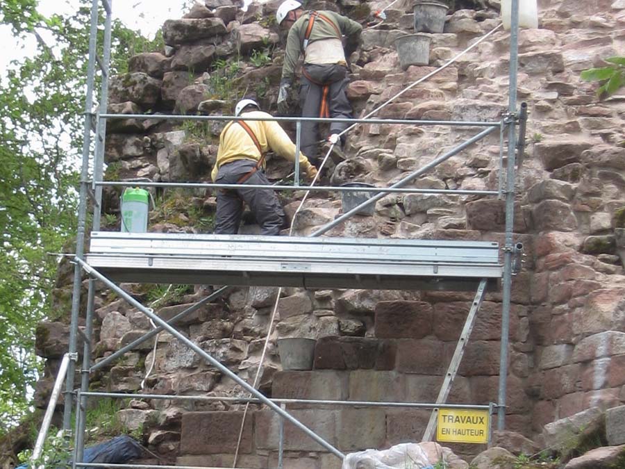 Situé entre 812 et 817 mètres d’altitude, le château de Salm est parmi les sites castraux les plus hauts du massif vosgien. A l’approche de l’hiver, où les conditions peuvent être particulièrement difficiles, il faut impérativement fermer correctement les chantiers. L’un des derniers travaux de l’année fut donc le démontage des échafaudages pour les protéger du gel, de la neige et du vent.