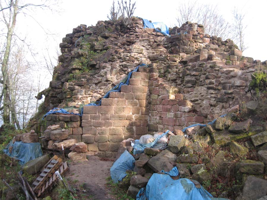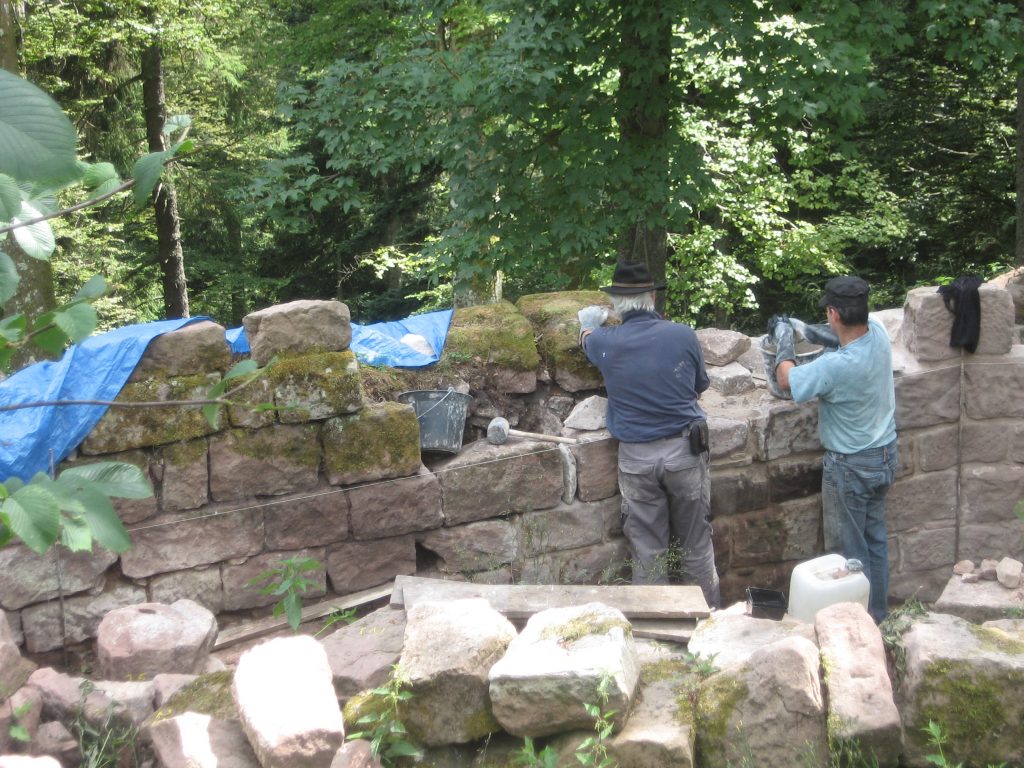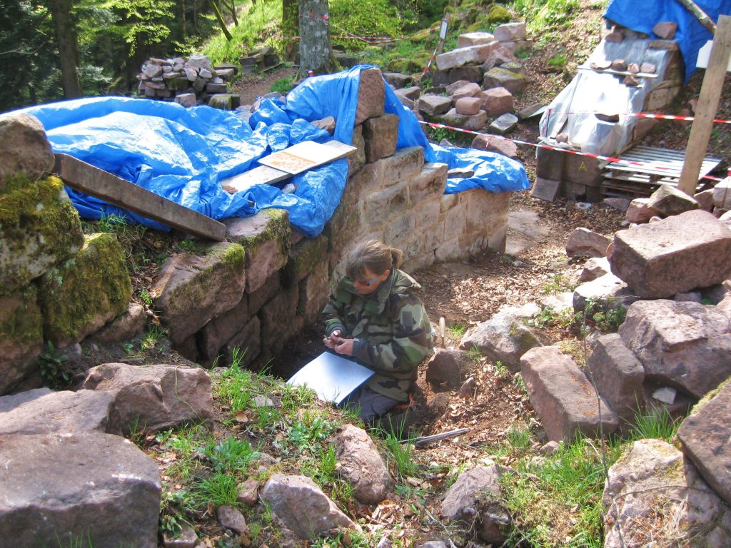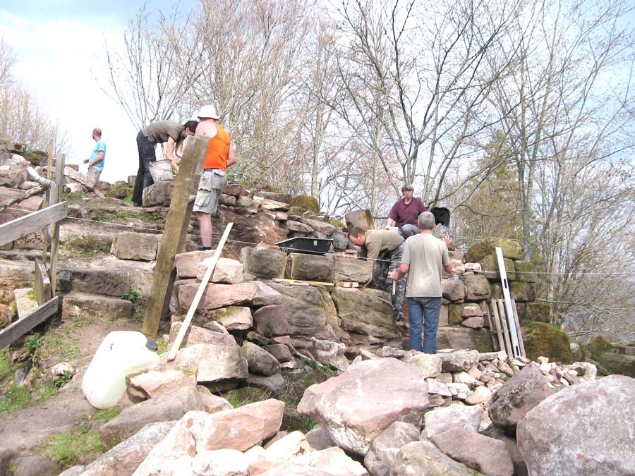 Dégagements programmés, avec autorisation de la DRAC Alsace sur la tour de flanquement nord–ouest : 30m2 de mur de la tour, de la courtine et du mur bouclier ont été pour l’essentiel mis à jour sous les éboulis. Suite de l’entretien sur la végétation.