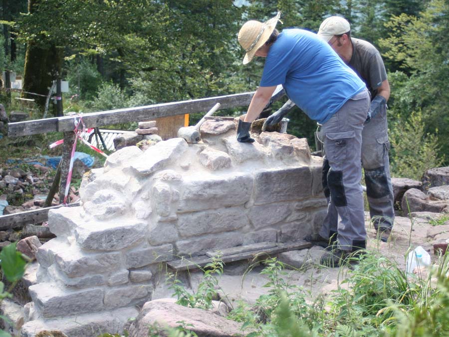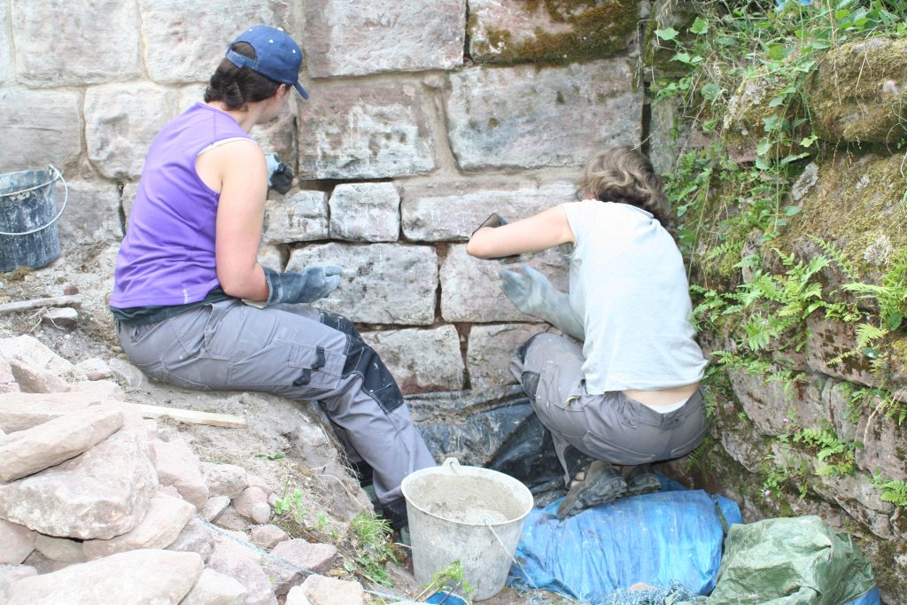 Cette année a été consacrée également au décaissement de la barbacane où plusieurs blocs menaçaient de disparaître des arases. Ce mur intérieur barbacane part rejoindre le parement extérieur du mur d’enceinte Sud bassecour (courtine – liaison sans chaînage de maçonnerie) vers le Nord, et la base de la grande tour en fer à cheval (donjon bouclier) vers le Sud. Ce mur est percé dans sa partie Sud, de la seconde porte d’accès au château. Nous avons bénéficié sur ce chantier du concours de 7 jeunes étudiants de l’école d’architecture de Strasbourg (ENSAS) dans le cadre de leur stage qui a duré un mois. Après décaissements, identifications puis déposes de 8 blocs de parement, sur les 2 faces du mur, en jonction avec le montant appareillé Nord de la seconde porte, la maçonnerie fut reposée à l’identique et un jointoiement a été réalisé. Une grande partie Sud du second mur barbacane a pu être rejointoyé sans autres travaux, vu le très bel état de ces vestiges.