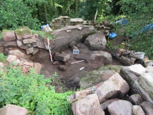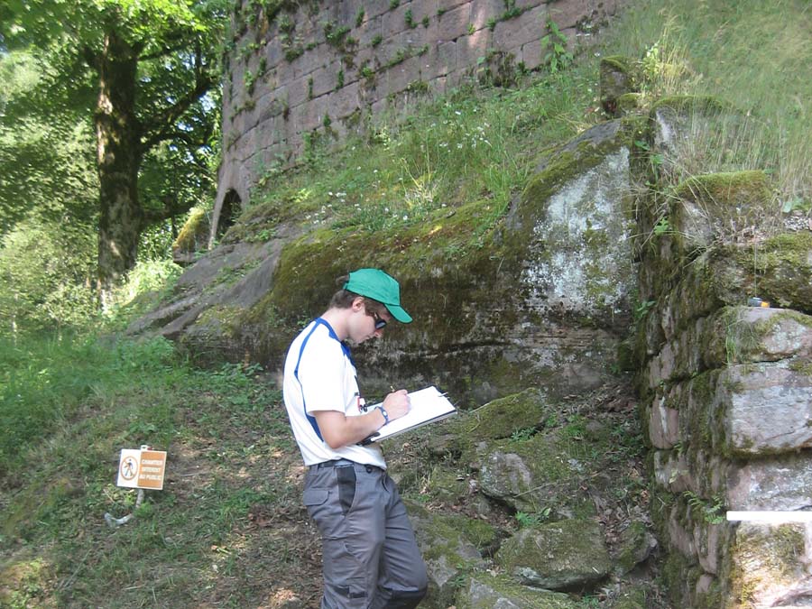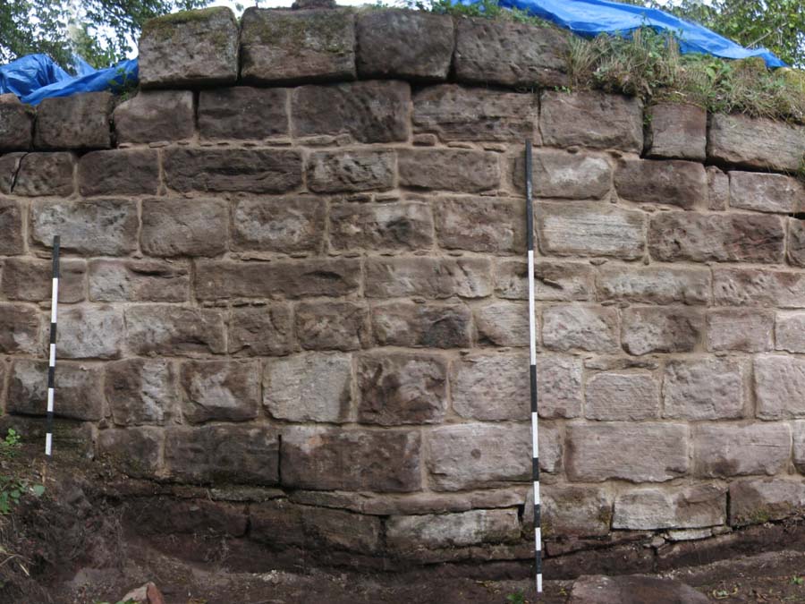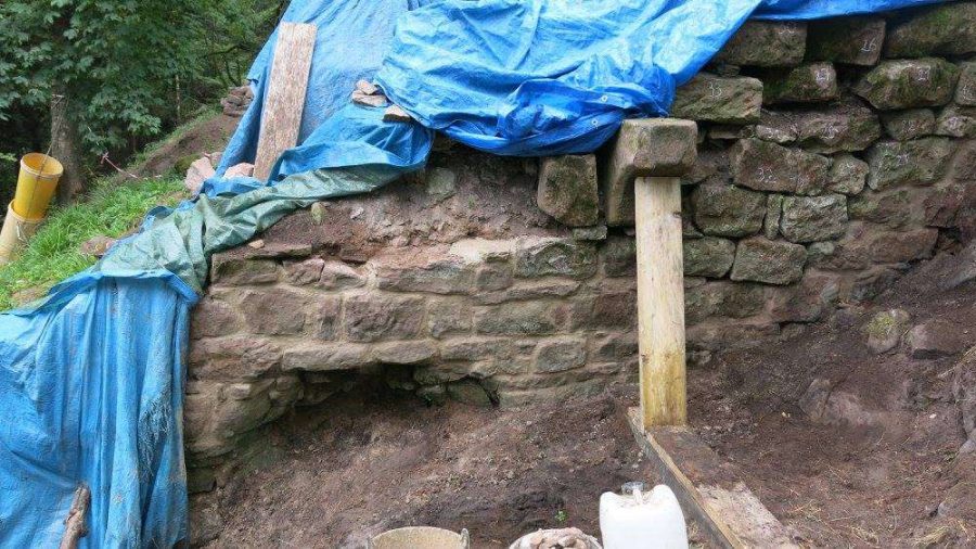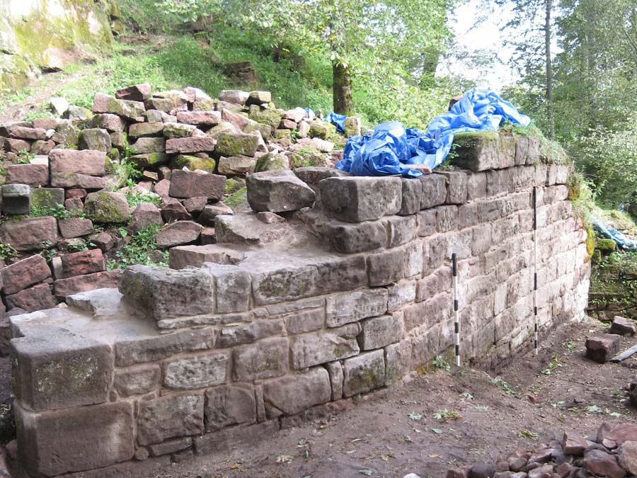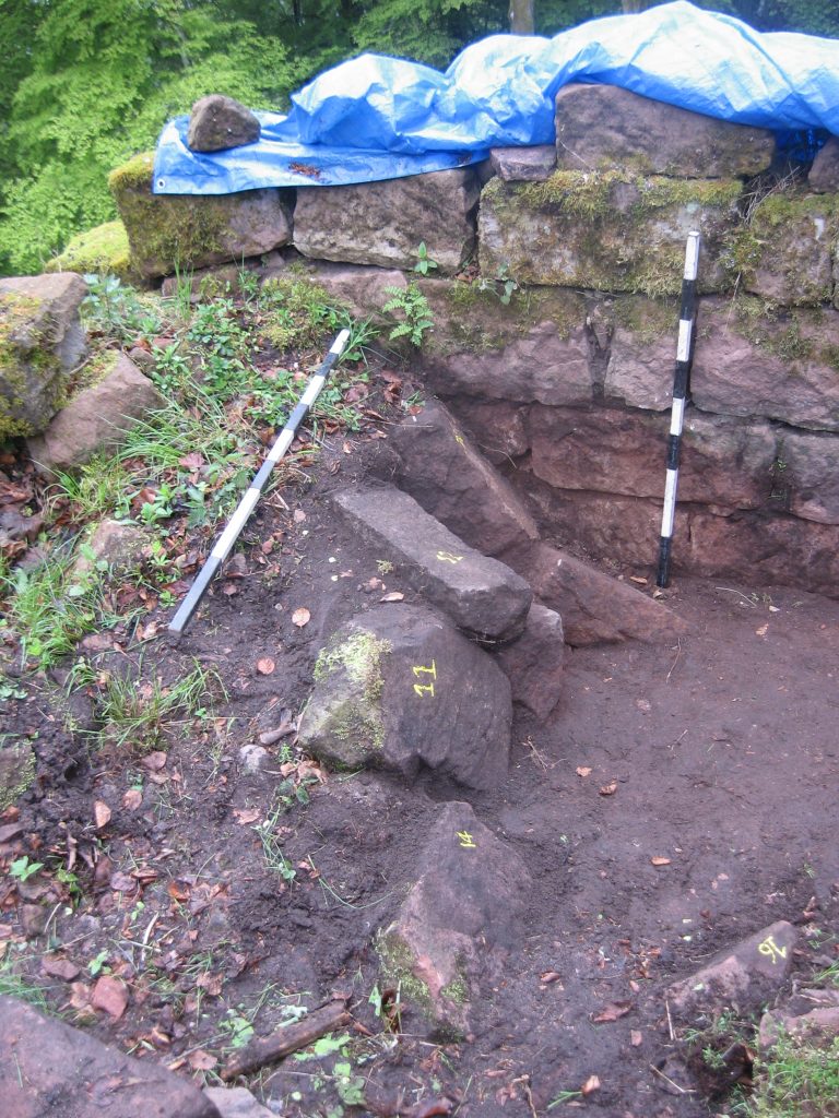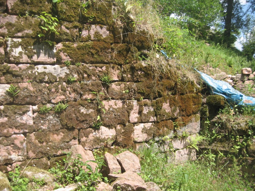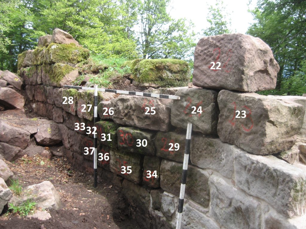 De plus, nous avons débuté les travaux de prospection le long du mur d’enceinte Sud bassecour (une courtine dans le prolongement du mur bouclier). Cet élément s’est révélé cohérent dans ses maçonneries et avec une élévation intacte sur près de 4 mètres. Nous sommes en présence d’un mur avec des arrachements en partie haute en « forme d’escalier », d’une épaisseur de près de 1,5 mètres à la base ; Ces fondations sont posées sur le socle rocheux, taillé en terrasses, dans l’arrête gréseuse sur le flanc Sud de la Kernburg.