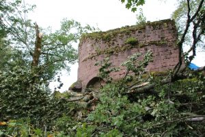 L’environnement forestier du site castral, portant les traces des conditions météos d’altitude, a été bien modifié ces dernières années. En 2016, deux hêtres, plus que centenaire, touchés par la foudre et terrassés par les maladies, ont été coupés par l’ONF, et cette année 2017 un érable et un hêtre ont souffert durant le coup de vent du 13 septembre. L’érable centenaire a perdu un bon tiers de sa hauteur, heureusement sans faire de dégât à la tour bouclier, qu’il a pourtant frôlé. L’agent ONF de Salm est monté pour procéder à un examen et a conclu qu’ils étaient rongés par un champignon. Il a donc organisé une coupe complète, qui a donné lieu à un chantier de bûcheronnage de grande précision, pour garantir l’intégrité des vestiges.