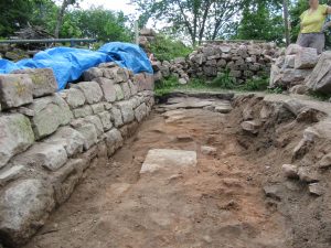 Après le décaissement des têtes d’arases l’année précédente, nous avons, en 2016, maçonné à l’identique les vestiges mis au jour sur une hauteur d’environ un mètre, après identifications, numérotations puis démontage de tous les éléments qui le constitue. Nous nous sommes concentrés cette année sur le parement intérieur de la courtine (épaisseur de 1,60m, à sa base à 1,20m en tête d’arase).